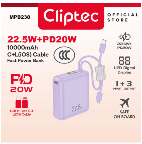 • Cliptec MPB238 10000mAh 22.5W+PD20W Fast Charging CCC Mini Power Bank with built-in Lightning &Type-C Cable